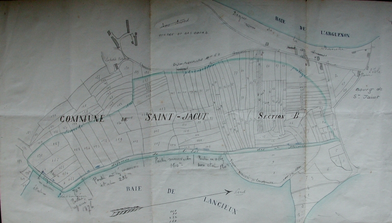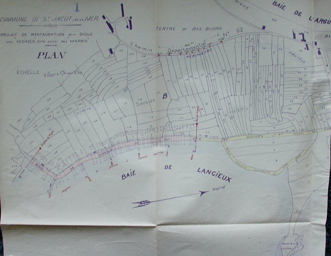 La digue ou chaussée des Moines A l'est du sillon, les moines ont érigé vers 1430 sous l'impulsion de l'abbé Péan de Pontfily une digue nord-sud, dite encore aujourd'hui "digue des Moines", reliant la petite presqu'île de la Justice, au fond de la baie de Beaussais. Cette digue ou levée de terre protégeait le sillon sur son versant est et permettait d'endiguer les terres et de créer des polders en asséchant les marais. Ces terres sont néanmoins restés longtemps inondables. Remarque : un sillon au sens moyenâgeux est "une levée de terre sur laquelle il y avait de l'herbe". La digue et la flèche de dunes sont visible sur la carte du chevalier Mazin (1758). En 1871, le plan des Ponts-et-Chaussées indique l'emplacement de la digue des Moines et de la digue de la Banche. Le rapport de l'ingénieur rappelle l'historique de la digue (construite par les moines bénédictins de l'abbaye de St-Jacut, propriétaires des marais), énonce ses dénominations successives et décrit sa géomorphologie (un massif en terre avec un revêtement maçonné du côté du large en pierres sèches, sur une longueur totale de 1100 mètres dont 600 mètres abrités par les apports de la mer). Selon la tradition orale, les digues contre-gardent les marets. En 1774, il y a les petites et grandes digues des religieux (selon les ingénieurs géographes). Cette année 1774, un groupe de jaguens achètent aux religieux les marais de la Manchette avec engagement de bâtir une digue (Ad 22 20G 877). en 1912, on cite la prairie dite "des religieux", en 1993, la dénomination devient la "digue des moines". En 1874, le perré de la digue est disloqué, une grand partie de la digue s'est affaissée. Une petite partie de la digue est réparée en 1876, mais les propriétaires riverains réclament à l'Etat de prendre en charge l'ensemble des travaux nécessaires. En 1887, un projet d'association syndicale est à l'étude pour la remise en état et l'entretien de la digue, des maçonneries, des rigoles d'égouttage et du roc d'égouttement. Cependant, le ministère refuse d'engager ces travaux (1893), à charge des propriétaires des terrains. Le plan de ces terrains, représentant une trentaine d'hectares, est réalisé en 1900, afin de mieux connaître l'état des parcelles et d'identifier leurs nombreux propriétaires. Il faudra attendre l'année 1901 pour que le syndicat des marais et de la digue voit le jour et l'année 1953 pour que des travaux soient enfin réalisés, avec une participation de 30 % des dépenses par l'Etat (le solde par la commune, le Département et les riverains). L'entreprise Coignet de Saint-Quay-Portrieux remplace en 1953 la digue de terre par un profil transversal en maçonnerie (béton armé), équipé de contreforts tous les 4 m, avec un voile de béton en recouvrement. Elle établit de nouveaux remblais de marne, rehausse les perrés à la cote 13, 70 m et bouche les trous. 602, 50 mètres de digue sont ainsi restaurées en amont. La digue des Moines, appelée par les anciens Jaguens "la digue des Berjaes" et aujourd'hui "digue de défense Est", consolide le rattachement de la presqu'île de Saint-Jacut au Sud de la Pointe de la Justice. Elle protège aujourd'hui le camping et la zone artisanale maritime et quelques marais non cultivés.