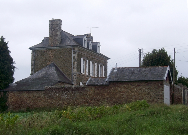 Maison de type ternaire à double orientation construite en moellons de granite et schiste. Couverte d'un toit à croupes, elle est flanquée de chaque côté d'une aile basse de plan massé. Eléments de décor : ferronnerie, granite (bandeaux, chaînes d'angles, encadrement des baies).