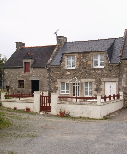 Logis en alignement construits en moellons de granite et schiste. De gauche à droite : logis à pièce unique et comble à surcroît, logis à deux pièces au rez-de-chaussée, probable logis remanié à pièce unique par étage, logis réunissant une pièce à usage d'habitation et une pièce à usage de dépendance (cellier ?).