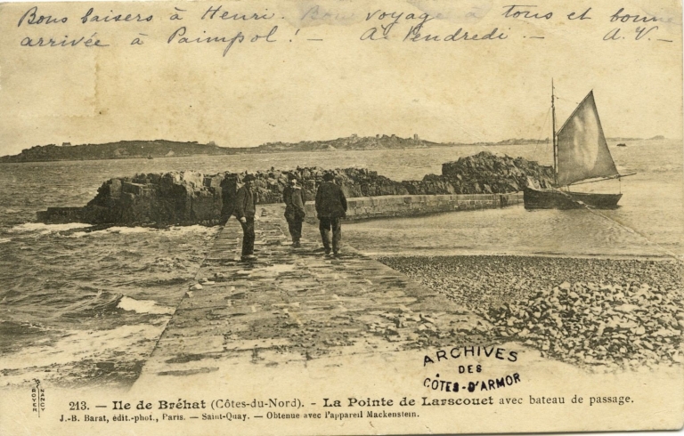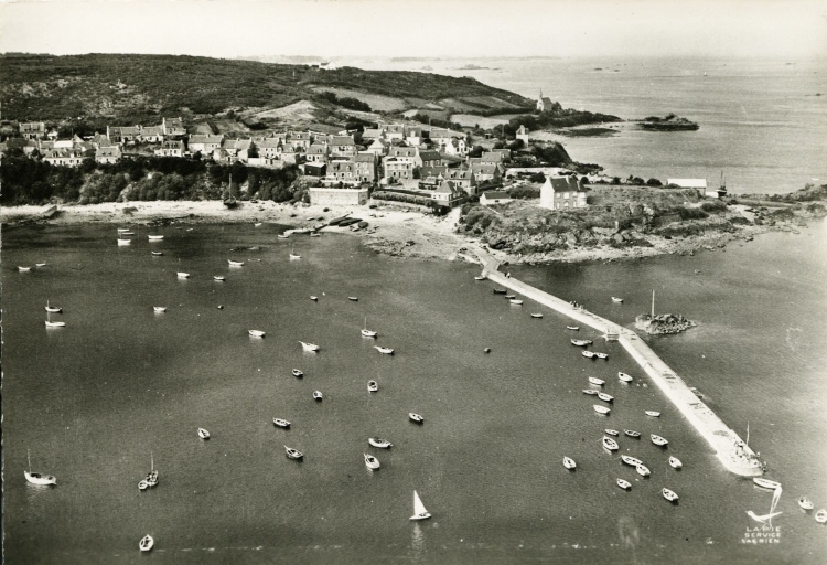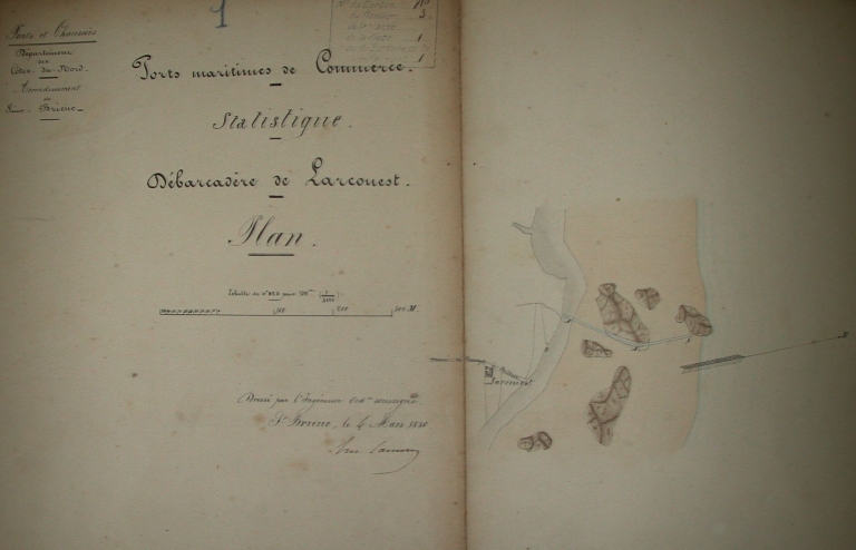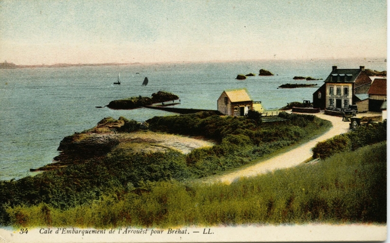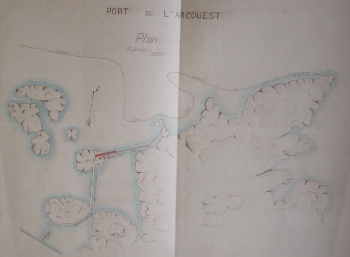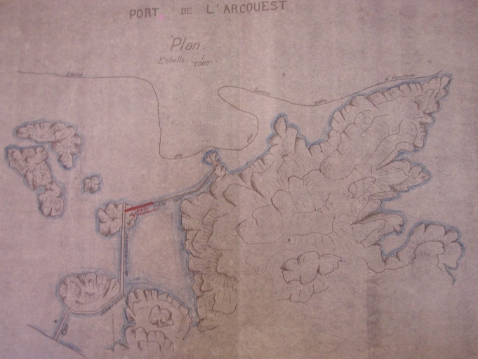 En 1920, le port de l'Arcouest comprenait deux cales : la cale haute, d'une longueur de 295 mètres (à la cote comprise entre 12 m et 3, 60 m), équipée d'un escalier en aval, et la cale de basse mer, d'une longueur 162 mètres (à la cote 1, 60 m et à la cote 1, 30 m sur 26 mètres, en aval). Un chemin d'accès menait à l'embarcadère. La grande cale a été établie sur un plateau rocheux peu accessible en aval (sur une distance de 40 mètres). L'accostage ne pouvait se faire qu'en amont du massif (cote - 3, 60 m). A marée basse, l'accostage était difficile sinon impossible. Les canots pouvaient accoster à la cale de basse mer que lorsque la mer dépassait la cote de 0, 60 m. Le transbordement était souvent nécessaire en canot.