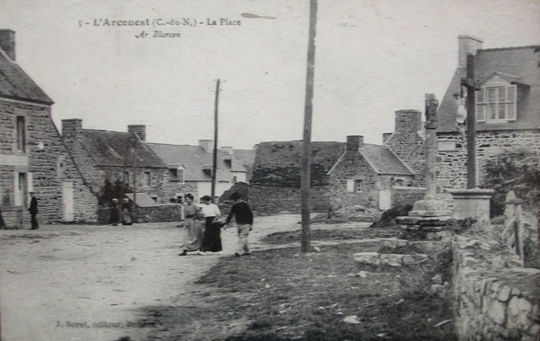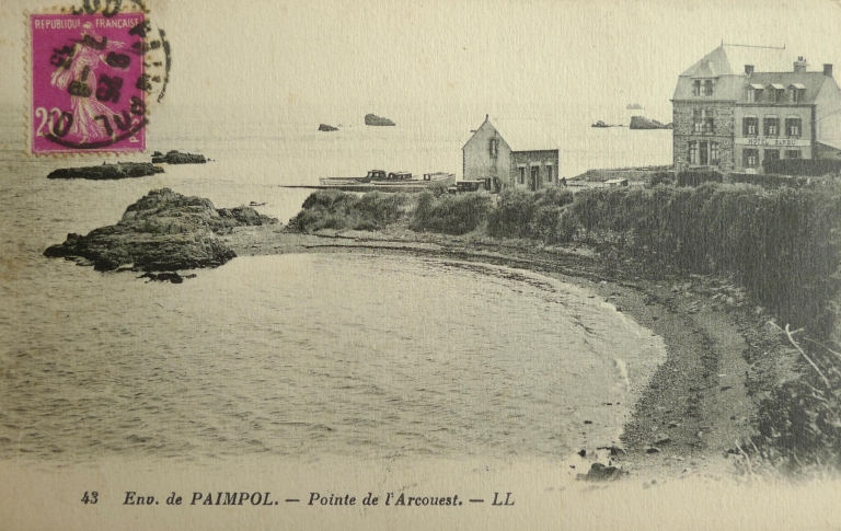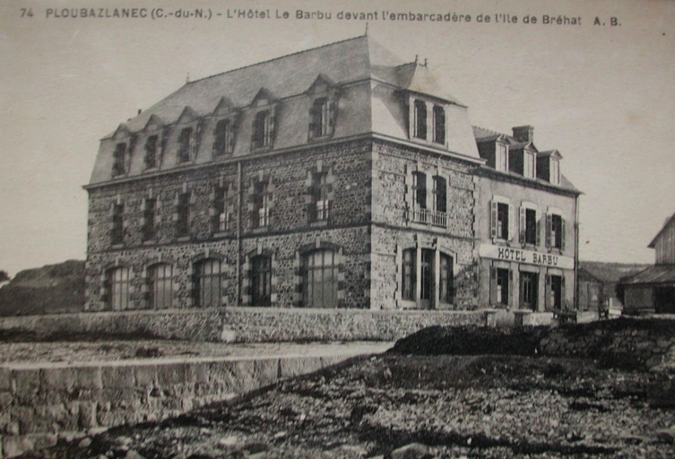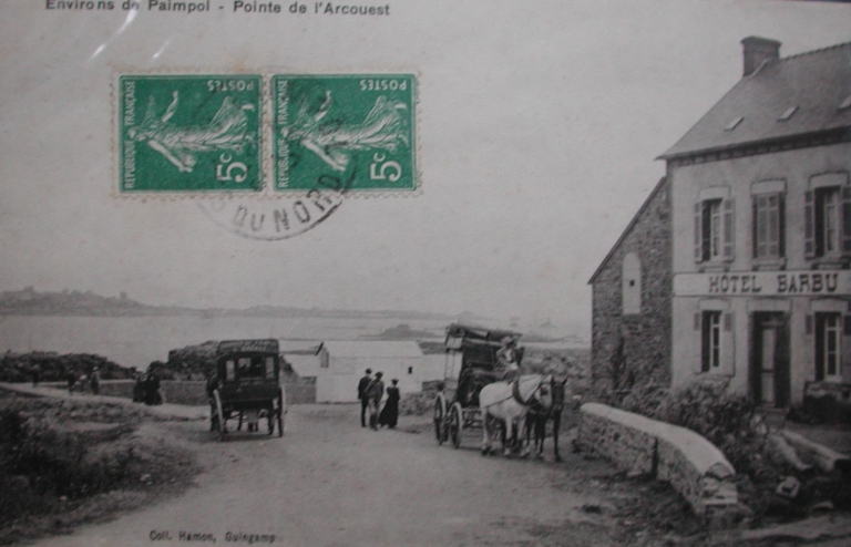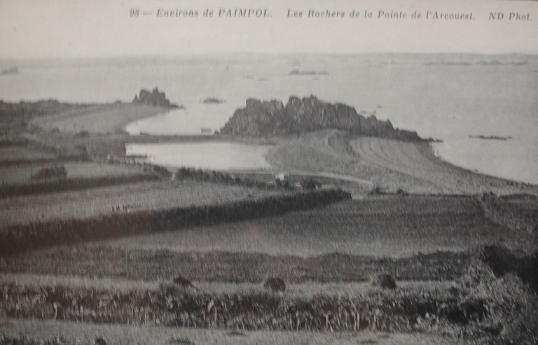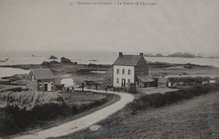 Le front de mer de l'Arcouest était peu habité au 19ème siècle, à part l'embarcadère pour l'Ile de Bréhat, où une première résidence à usage de pension de famille puis d'hôtel (Hôtel 'Le Barbu'), fut construite à la fin du 19ème siècle (vers 1898), sur une concession du Domaine Public Maritime. Ce premier immeuble était à l'époque en concurrence avec le modeste bâtiment en bois, du restaurateur Auffret, situé à 10 mètres de la cale. Plusieurs cabanes en bois furent construites dans un premier temps pour abriter les bagages des premiers touristes qui arrivaient de Paimpol en voiture à cheval. Puis ce furent de nouvelles concessions qui furent accordées aux armateurs des vedettes dans le 1er quart du 20ème siècle pour assurer la billetterie des passages. Il faut encore préciser qu'un abri pour les douaniers est signalé sur un plan daté de 1898, en même temps que les premières cabines de bains. Le cadastre de 1832 signale un corps de garde sur les pointe de l'Arcouest, mais aucune habitation entre Traou L'Arcouest (le contre bas du plateau) et le plateau lui même. Le front de mer a commencé à s'urbaniser au début du 20ème siècle avec l'installation des familles de scientifiques et d'artistes parisiens, dont la maison de Marie Curie (en baie de Launay), séduits par la beauté du lieu. En 1932, un premier panneau était installé à la pointe de l'Arcouest afin de vanter les mérites touristiques de l'Île de Bréhat. L'hôtel 'le Barbu' s'est considérablement agrandi au milieu du 20ème siècle et a attiré une riche clientèle, tout en permettant à des petits commerces de s'installer. Le site s'est aujourd'hui davantage urbanisé avec de nouveaux commerces, et l'aménagement de parkings sur des espaces autrefois cultivés. Le vocable 'L'Arcouest' est peut-être tiré du nom des comtes du Goëlo, Harcouët, Harcouët ou Harcouest, 'celui qui portait un bouclier de fer ('hoiarnscoit' en vieux breton) ; ou de la veillée des morts ('arc'houset), d'après les recherches de Gordon Carter.