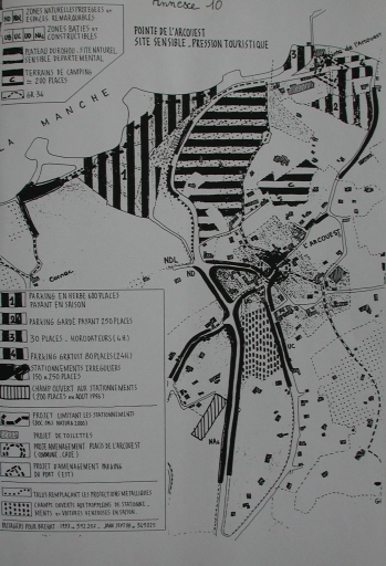 La route étroite et sinueuse, qui conduit au port de l'Arcouest, découvre au Nord un paysage d'archipel de l'Ile Bréhat au sillon du Talber, et au Sud, un paysage d'estuaire. Le chenal du Ferlas ('Ganol war Laez', 'ar Varlez', chenal vers la haute mer où le flot porte à l'Est), parcouru de courants violents, sépare Bréhat de l'Arcouest. Les pentes Nord du plateau de l'Arcouest étaient exemptes d'habitations à la fin du 19ème siècle. Seules quelques habitations formaient le village de l'Arcouest sur le plateau. La proximité de l'Ile de Bréhat a entrainé le développement d'équipements portuaires, l'aménagement de bâtiments de service et de parkings pour acueillir le plublic des traversées et la construction de commerces à usage de cafés et d'hôtels. Un double cordons de galets, dit 'tombolo de l'Arcouest' ferrme une zone humide au sud-ouest du site, en contre bas des terrains occupés aujourd'hui par un grand parking.