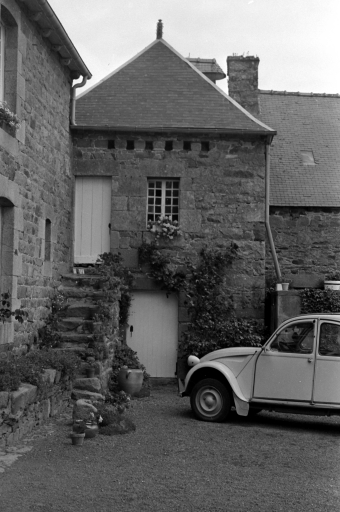 Ferme à cour fermée construite en moellons de granite. Elle comprend un logis de type ternaire et à baies surnuméraires latérales en façade antérieure. La porte d'entrée à traverse d'imposte présente le millésime 1825. Le versant antérieur du toit présente des lucarnes à croupe sommées chacune d'un épi de faîtage en terre cuite vernissée. Elle comprend également, de part et d'autre du logis, un corps de bâtiment de plan massé à deux étages couvert d'un toit en pavillon et dont la partie haute du mur antérieur est percée de trous à pigeons.