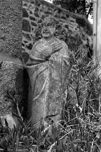 Croix en granite composée d'un soubassement, d'un socle et d'un fût sommé d'une croix terminale ornée d'un Christ en croix. Deux statues en ronde-bosse rapportées sont situées au pied de la croix (saint Jean et Vierge au visage mutilée).