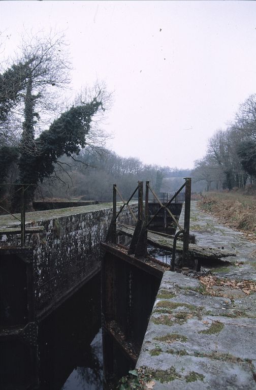 En 1827, adjudication du 5e lot des travaux de construction du canal en faveur de l'entrepreneur Bourdonnay. La porte aval a été réparée ou remplacée en 1890 par le constructeur rennais Lemoine.