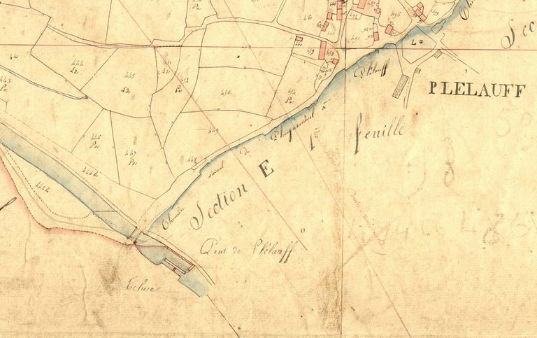 Plan du canal de Nantes à Brest dans la traversée des Côtes-du-Nord. Plan, [s. n., vers 1830]. Papier, encre, aquarelle, 129x45. [également conservé aux Archives départementales des Côtes-d'Armor, série 9 S 6/2 ].