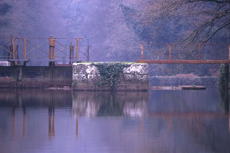 Écluse à sas ; grand appareil de granite ; bittes d'amarrage. État actuel : descellement et fuites importantes ; portes métalliques en place ; porte amont scellée par du béton. Déversoir & vanne au niveau de la porte amont. Déversoir rectiligne ; îlot : pierre de taille de granite. État actuel : passerelle métallique récente. Vanne : culée en pierre de taille de granite. État actuel : obturé.