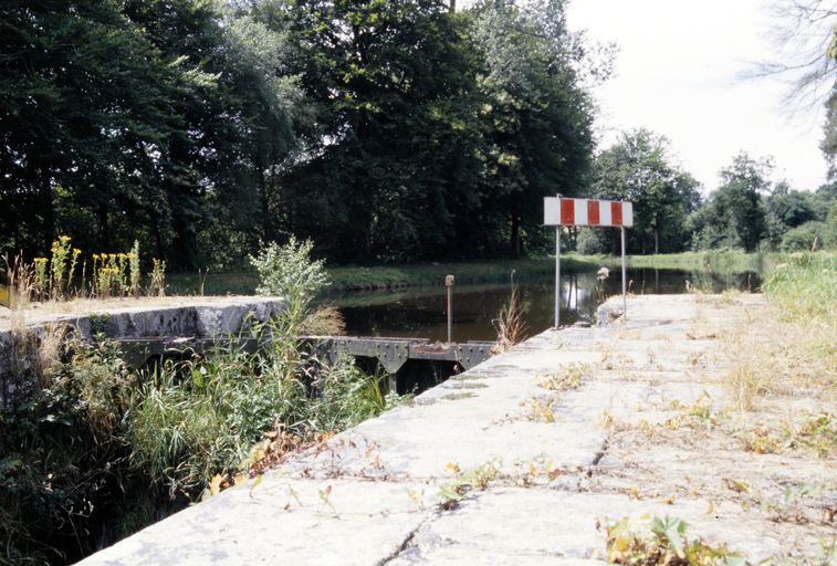 Écluse à sas ; pierre de taille de granite ; porte amont : cadre métallique et panneaux de bois ; bittes d'amarrage. État actuel : pierres des bajoyers descellées, porte aval métallique, crémaillères, passerelle et garde-corps amont disparus.