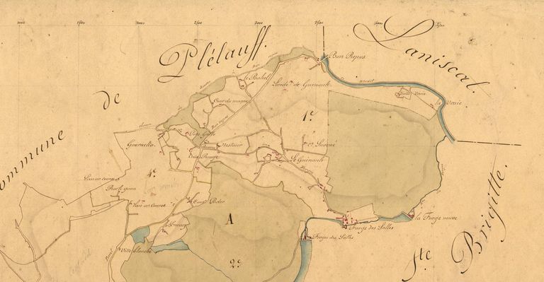 Plan du canal de Nantes à Brest dans la traversée des Côtes-du-Nord. Plan, [s. n., vers 1830]. Papier, encre, aquarelle, 129x45. [également conservé aux Archives départementales des Côtes-d'Armor, série 9 S 6/2 ].