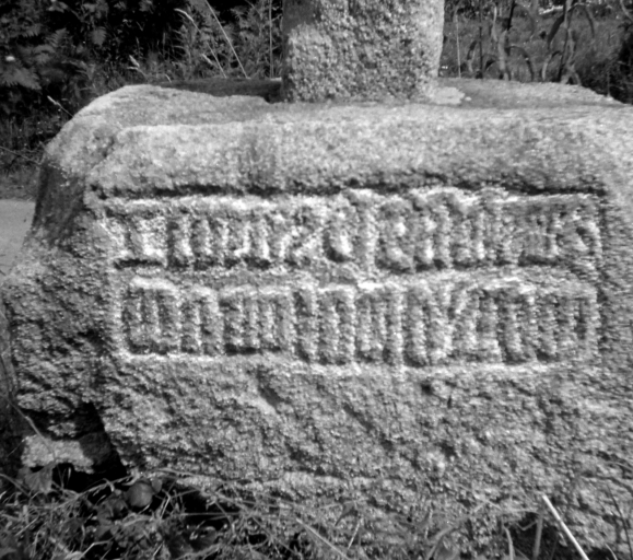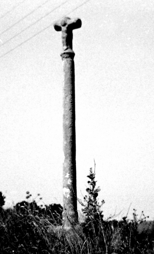 Croix de chemin en granite composée d'un socle à griffes et d'un haut fût monolithe sommé d'une croix terminale ornée d'un Christ en croix et d'un personnage non identifiable (décor usé). La face latérale gauche du socle présente une inscription non déchiffrée.