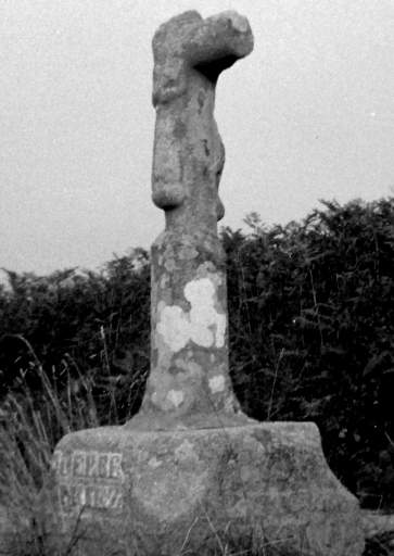 Croix de chemin en granite fortement remaniée. Elle est composée d'un socle à griffes et d'un fût à l'état de vestige portant une croix ornée d'un Christ en croix vêtu d'un pagne long et d'une Vierge à l'Enfant. Le socle porte une inscription non déchiffrée.