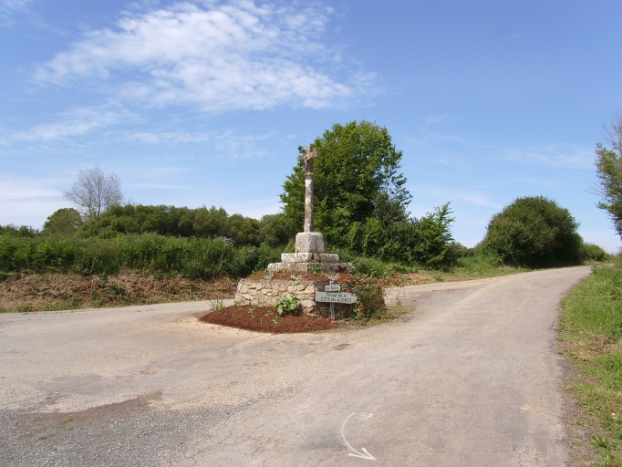 Croix de chemin composée d'un soubassement formé par une base en maçonnerie de granite portant un emmarchement à deux degrés, d'un socle et d'un fût monolithe sommé d'une croix terminale dont la face antérieure présente un Christ en croix. La face antérieure du socle porte une inscription dont la lecture s'avère incertaine.