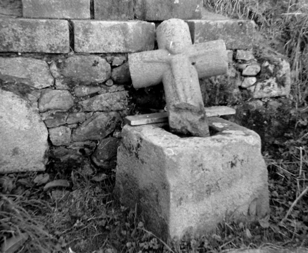 Croix de chemin remaniée dressée sur un socle à griffes posé sur un soubassement à degrés en granite. La face antérieure est ornée d'un Christ en croix schématique vêtu d'un pagne court. La face postérieure du socle porte l'inscription O CRUX AVE SPES UNICA : Ô croix notre unique espérance).