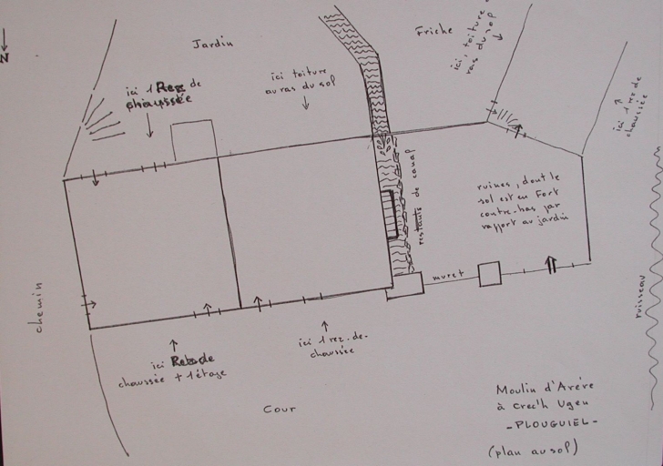 Le site du moulin est situé à la rencontre des eaux douces et des eaux salées de la baie de l'Enfer et du ruisseau du Lizildry, sur la rive droite, au lieu dit Crec'h Ugen. Le plan de l'ensemble du bâti réalisé lors de cette première enquête (fig. 2 et 3) montre plusieurs bâtiments annexes (en partie en ruines) et des dépendances recouvertes de tôles, dans le prolongement du logis du meunier. Seule la maison du meunier existe encore aujourd'hui. Elle a été entièrement rénovée et remaniée. Le bief subsiste encore avec la chute d'eau et une partie de la chaussée. L'ensemble a été transformé en atelier ostréicole. Il comprend l'ancienne maison d'habitation du meunier de plan rectangulaire, avec un étage sous combles, associée dans son prolongement à un bâtiment accolé (toit en terrasse), utilisé comme atelier ostréicole. Une partie du plan d'eau au Nord-Est du moulin a été comblé. Le bief est en partie en état.