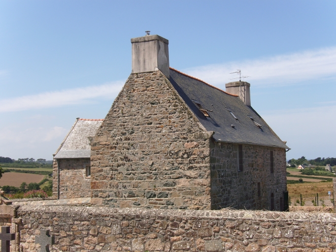 A l'ouest de l'église paroissiale, l'ancien presbytère de Plougrescant est un édifice à cour fermée construit en moellons de granite et schiste sur un plan d'ensemble en L. Il se compose d'un logis, probablement de type ternaire, couvert d'un toit à longs pans à égout retroussé et pignons découverts à rampants à crossettes et d'un bâtiment en retour d'équerre, quasiment de la même hauteur. L'entrée de la cour est située au droit de l'entrée du logis.