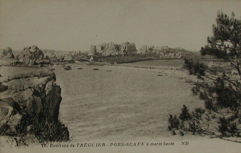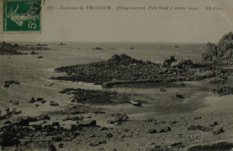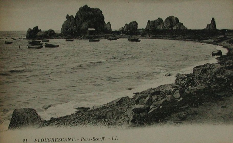 Pors Scaff était autrefois appelé 'Pors Lescaff' dans les documents nautiques. 'Pors Skav' signifie en breton le 'port de la barque'. Le cordon de galets était utilisé pour le séchage du goémon. Le port naturel a été aménagé au cours du 19ème siècle avec un enrochement de forme convexe afin de protéger la petite baie Ouest de la houle. Une digue, construite à la fin du 20ème siècle, protège le front de port. Une petite cale de mise à l'eau en béton a été aménagée récemment entre le cordon de galets Est et la digue.