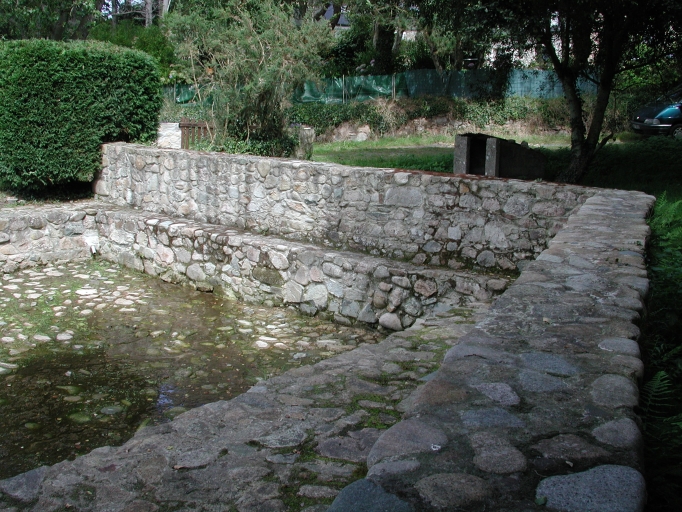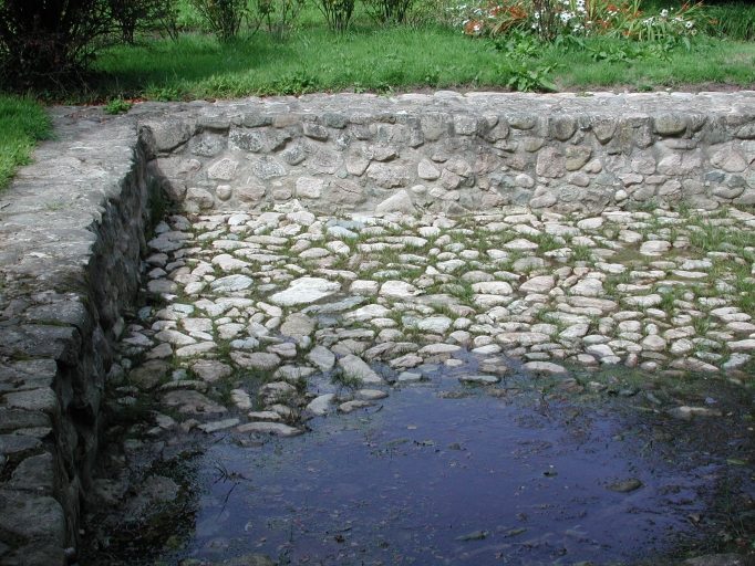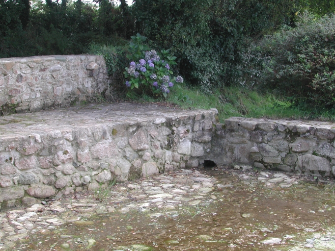 La fontaine a été rehaussée et doublée avec des parpaings en ciment. Elle est construite avec de belles pierres en granite rose taillée et recouverte d'une couverture en tôle de métal. La fontaine mesure hors tout 120 cm de hauteur et 120 cm de largeur et dispose d'un petit bassin rectangulaire. Le lavoir, associé par une consuite d'eau et un petit bassin, est constitué d'un bassin en ciment de 250 cm de longueur sur 200 cm de largeur. Le routoir est situé dans une propriété privée, dont il forme une partie du mur d'enceinte. Le routoir est construit avec des moellons de granite et un fond dallé en galets et en moellons de granite. Il a un plan carré et mesure 10 mètres de longueur sur 10 mètres de largeur, avec une hauteur de 0, 80 mètre. Le routoir a été restauré par les propriétaires du site. A proximité de cet ensemble d'édicules liés à l'eau, on peut signaler un chemin creux bordé de talus.