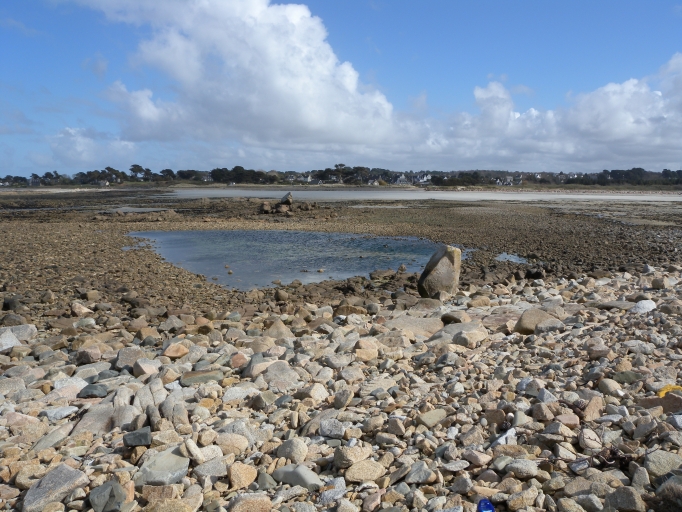 L'Île Bruc mesure seulement quelques centaines de mètres carrés. Cette île rocheuse forme un 'crec'h', avec une petite lande de fougères. On peut remarquer une cuvette au Sud-Est derrière un cordon de galets, une roche détachée au Sud de l'îlot 'Run Nevez' ('Roche Nouvelle') et le sillon reliant l'ïle Bruc à la terre 'Graou Brug. L'échouage au Sud de 'Graou Brug' s'appelle 'Ar Glazoueier', 'Les herbiers'. Il existe une passe de pleine mer entre 'bonnez' ('Bornes'), soit deux têtes de roches plates à l'Est de 'Karreg an Normand' (roche très poîntue) et 'Penn-Glaozouier'. La pêcherie se trouve au Nord-Ouest de l'île Bruc. Elle est nommée 'Ar Gibellou' ('Les Cuvettes') sur la carte marine. Cette longue barrière rocheuse formant un petit 'loc'h' au Sud-Ouest de Roc'h Meno, soit au Nord-Ouest de l'Île Bruc. Sur des vues aériennes IGN (1988 et 2000), Loïc Langouët a noté l´existence d´un barrage linéaire. Cette pêcherie barre un couloir entre des roches. Elle a une longueur de 48 m. Le niveau du sol est de : +2,25 m/0 SHOM.