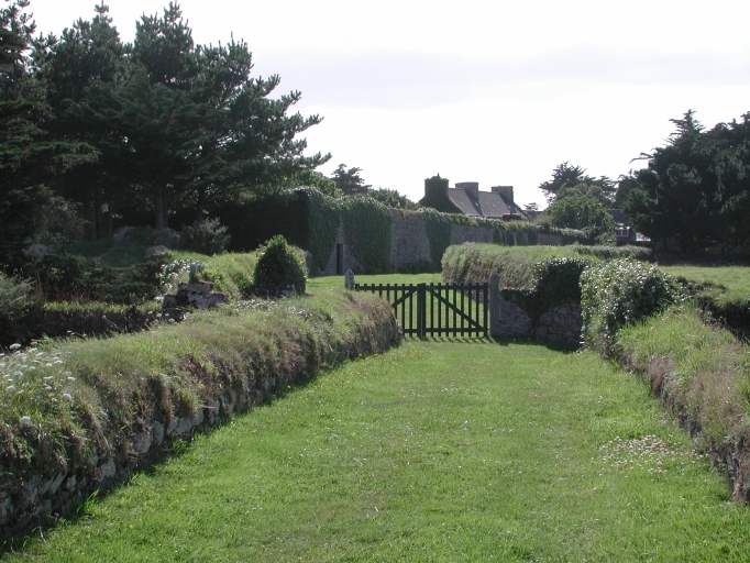 Le réservoir d'eau salée a une surface d'environ 1 hectare et demi. Il est délimité par un cordon de galets au Nord et par une digue au Sud. Cette digue, longue d'environ 100 mètres, large de 4, 50 mètres et haute de 3 mètres, est édifiée en moellons de granite, posés à sec. Le mur de la digue a un fruit accentué du côté du réservoir et vertical du côté de la mer. Elle est pourvue d'un pertuis et ferme l'anse naturelle. En des temps relativement récents, elle a dû prendre la suite d'un barrage de pêcherie, tant le site est propice au piégeage des poissons et crustacés (fig.1). On peut remarquer l'existence de deux autres pêcheries liées à cette île. Le niveau du barrage 'B' se situe environ à + 3 mètres du '0' de la carte SHOM. Par contre les bases des barrages 'A' et 'C' se trouvent à un niveau supérieur de l'ordre de +5 du '0' de la carte.