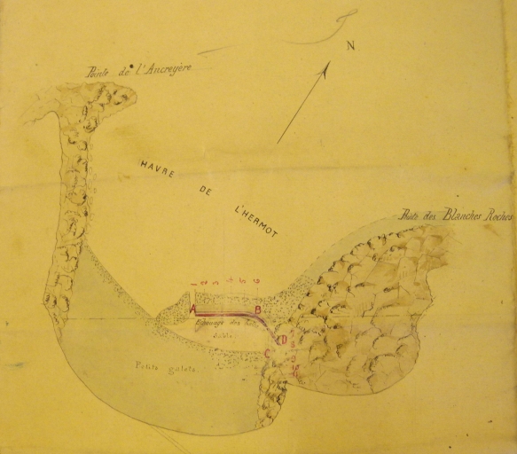 Selon le rapport de l'ingénieur des Ponts-et-Chaussées, Hélary, rédigé en 1931, il existait au port de l'Hermot ou Havre de Pordic (Petit-Havre), avant 1864, un petit môle en enrochements, de 1 mètre environ de hauteur, à l'abri duquel venaient s'échouer 4 canots, jaugeant ensemble 10 tonneaux. Cet enrochement nous semble avoir été réalisé à l'origine, pour servir de pêcherie et ensuite de digue abri. En effet, le plan daté de 1897 et la vue n° 9, montrent une ancienne ouverture dans les enrochements, ayant pu servir de pertuis. En 1863-64, un projet de port-refuge fut réalisée selon les plans de l'ingénieur De La Tribonnière, avec la construction d'une jetée-abri, prolongée par un musoir. Cette digue subit régulièrement des avaries à cause de son exposition aux vents de Nord à Nord-Est. Elle fut en partie détruite vers 1880 : musoir affaissé et brise mer rompu sur 19 mètres. Un nouveau projet réclama l'exhaussement du môle en 1897 à la cote de 7, 50 mètres pour une hauteur de 2 mètres, avec des blocs de 1000 kg. A cette époque, 6 canots fréquentaient le petit port. Ce projet fut ajourné jusqu'en 1912. La digue fut enfin réparée en 1922, mais sans travaux d'exhaussement supplémentaire. Les cartes postales anciennes datées du 1er quart du 20ème siècle montrent le Petit-Havre fréquenté par moins d'un dizaine de bateaux de pêche, avec parfois un amarrage sur des pieux en bois. Aujourd'hui, le Petit-Havre n'est plus fréquenté par des bateaux, en raison de la concurrence des ports de Binic et de Saint-Quay-Portrieux. La qualité submersible de la digue, son manque d'aménagement et son ensablement continu, ont participé à la déshérence de ce havre portuaire, fréquenté uniquement aujourd'hui par les pêcheurs à pied et les baigneurs.