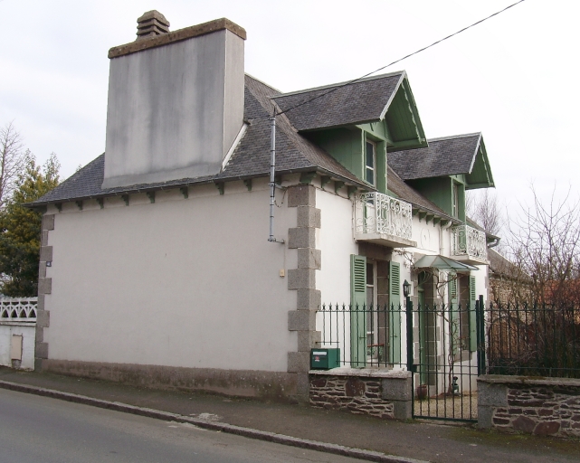 Maison de plan rectangulaire, à deux pièces au rez-de-chaussée et à accès antérieur central, couverte d'un toit à croupes. Le gros-oeuvre est couvert d'enduit, l'encadrement des baies et les chaînes d'angles sont édifiés en pierre de taille. La porte d'entrée est protégée par une marquise. L'étage en surcroît est éclairé en façade antérieure par deux lucarnes-pignon en charpente en bois précédée chacune d'un balcon. Éléments de décor : granite (pierre de taille), ferronnerie (marquise, gardes-corps), lambrequin (lucarnes).