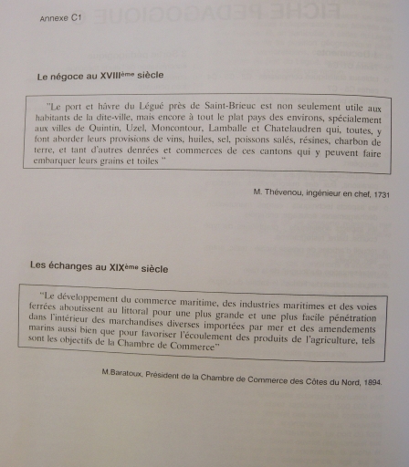 Il semble que le Légué ne soit pas le port primitif de Saint-Brieuc. Les premiers ports, 'Portus Aurélius' ('Port Aurel') et 'Portus Cessonius' ('Port de Cesson') auraient disparu à la suite d'un cataclysme survenu en l'an 709. Selon la tradition orale, C'est le port du Valais (appelé 'Port Glé') qui aurait été le port de Saint-Brieuc. Il menait encore les navires au début du 20ème siècle jusqu'au fond de la baie d'Yffiniac, avant que les phénomènes d'envasement ne changent la profondeur et la géomorphologie locale. L'un des derniers caboteurs, de 15 mètres de quille, s'appelait la 'Joséphine'. Il venait chercher des briques et des oignons à Langueux-Les-Grèves. A cette époque, la rivière d'Hillion, beaucoup plus large qu'aujourd'hui, passait le long de la côte. La 1ère mention du havre du Légué est datée de 1423, dans une lettre de change de Jean V, duc de Bretagne, donnée à son épouse Jeanne de France, pour le négoce et la pêche à Terre-Neuve. En 1556, on remarque l'existence de 'souilles' pour l'échouage des navires et la présence du manoir de l'armateur Favigo (t). En 1625, le manoir de Rohannec'h témoigne d'un commerce déjà actif. En 1687, L'armateur Le Roux arme pour Terre-Neuve, et en 1691, Saint-Brieuc devient le siège royal de l'Amirauté. En 1731, les premiers travaux portuaires sont réalisés : construction d'un pont en bois et du 'Chemin Neuf'. Pendant le 4e quart du 19ème siècle et le 1er quart du 20ème siècle, les travaux d'aménagement du port vont s'accélérer. Des armateurs et des commerçants, comme Alain Le Gouales de Mézaubran et la famille Sébert, vont favoriser le développement industriel et commercial du Légué : nouvelles lignes de fer et nouvelle ligne de transport maritime en direction des îles anglo-normandes (commerce de la pomme de terre). Le port du Légué devient à la fois un port de Grande pêche, de pêche côtière et un port de commerce, très actif pour son hinterland environnant (commerce des céréales, de la toile et des meules de moulin). Il est considéré comme un port-refuge, un port secondaire. Cependant, l'historique des travaux d'aménagement portuaire du Légué montre une succession de chantiers ponctuels et le manque d'aménagement global : En 1731 : premiers travaux portuaires d'après le plan dressé par l'ingénieur Thévenou : construction du Pont de bois. En 1756 : plan du Légué par l'ingénieur Chacat de Grandmaison. En 1758 : construction du quai d'Aiguillon et des premières cales, rectification du chenal. En 1733 : le quai et le pont sont détruits par le 'déluge de Châtelaudren'. En 1777 : édit royal donnant le droit d'armer pour les colonies. En 1783 : rectification du chenal sur 300 mètres et aménagement d'un nouvelle route d'accès au port. En 1784 : plan du port par l'ingénieur Perroud. En 1796 : Plan de 'Port-Brieuc' avec projet de nouvelles cales. En 1819 : création de la Chambre de Commerce et reconstruction du Pont-de-Pierre modifié. En 1837 : construction des quais de Nemours et de Rohanet En 1844 : prolongement du chemin de halage, rive gauche En 1847 : projet de bassin à flot En 1859 : projet de mise en communication du bassin à flot et du port d'échouage du Légué Entre 1868 et 1876 : Ecluse et bassin à flot en construction (achèvement de l'écluse en 1869). En 1881 : projet d'une double écluse. En 1885 : Achèvement et ouverture du bassin à flot, fonctionnement manuel de l'écluse. Construction de la voie ferrée, rive droite. En 1887 : projets d'avant-port à la Pointe-de-l'Aigle et d'allongement de l'écluse. En 1893 : ouverture du pont tournant livré à la circulation. Le port du Légué devient un port à bassins, le seul dans les Côtes-du-Nord, dont les équipements répondaient aux besoins économiques de cette fin du 19ème siècle. En 1904 : construction d'une voie ferrée, rive gauche. En 1915 : création du bassin à flot n° 2 et d'un barrage déversoir. En 1928 : électrification du système de manoeuvre de l'écluse. EN 1932 : nouveau plan d'équipement portuaire. En 1936 : allongement de l'écluse (+ 10 mètres), opération de désenvasement. En 1944 : écluse dynamitée et détruite. En 1946 : reconstruction et désenvasement, reprise du trafic, phase active, écluse portée à 85 mètres. En 1962 : avant-projet de modernisation portuaire ; nouveau feu à la cale de la Douane. En 1968 : augmentation du trafic portuaire et projet d'agrandissement du port. En 1969 : trafic portuaire à son apogée : projet de terre-plein. En 1975 : nouveau projet d'extension et construction du terre-plein de la Ville-Gilette. En 1981 : projet de port de plaisance. En 1985 : endigage à la Pointe-de-Cesson, désenvasement, chute du trafic. En 1991 : nouveau projet d'extension, projet de port de plaisance, difficultés de la pêche. En 1992 : projet de développement global du port. EN 1999 : premiers travaux d'aménagement du port de commerce. Les récentes améliorations portuaires ont augmenté la superficie des terre-pleins sur la rive gauche et facilité les mouvements des bateaux de pêche. L'endigage réalisé à la Pointe-de-Cesson en 1985 constitue un entonnoir dont les perrés ont servi au futur port. Après les graves crises économiques qui ont perturbé le trafic du port à la fin du 20ème siècle, plusieurs projets d'extension du port du Légué ont été étudiés par la Chambre de Commerce, avec le soutien du Conseil général, dont la réalisation en cours d'un grande digue à l'Est et du 3ème quai. Le port du Légué est aujourd'hui le principal port de commerce des Côtes-d'Armor et le 5ème port breton (trafic pour les bateaux de charge de 3000 à 5000 tonnes). Il est aussi devenu un port de plaisance et un site départemental de réparation navale, en particulier pour les navires de pêche de fort tonnage (350 tonnes). Les friches industrielles de la rive droite du Légué (Carré Rosengart, Chaffoteaux et Maury) sont devenues un a