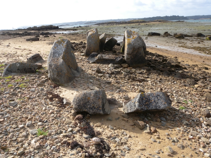 L'allée couverte de l'île Coalen, submersible à marée haute, est située sur l'estran, à l'extrémité Ouest de l'île. Elle mesure 7, 20 mètres de longueur, 1, 40 mètre de largeur et 1, 50 mètre de hauteur. La paroi Ouest est formé de 3 piliers et la paroi Est de 6 piliers. Au Nord de la dalle de chevet, un bloc isolé forme peut-être une des parois de la 'cella' terminale. Tout autour de la sépulture, des blocs épars sont peut- être les vestiges de l'entourage du tertre. L'allée couverte a perdu sa couverture. Elle est partie en ruines.