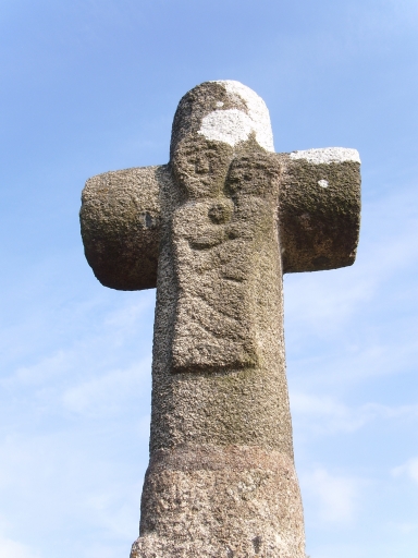 Croix de chemin à branches courtes en granite dressée sur un socle à griffes posé sur un soubassement moderne. Elle est ornée d'une Vierge à l'Enfant et d'un Christ en croix.