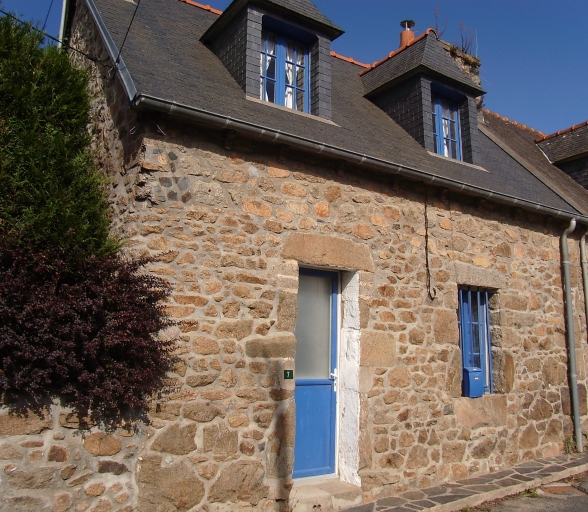 Maison mitoyenne à pièce unique au rez-de-chaussée et à accès antérieur latéral construite en moellons de granite et schiste. La fenêtre de la façade antérieure édifiée à l'aplomb de la rue est protégée par des barreaux en fer.