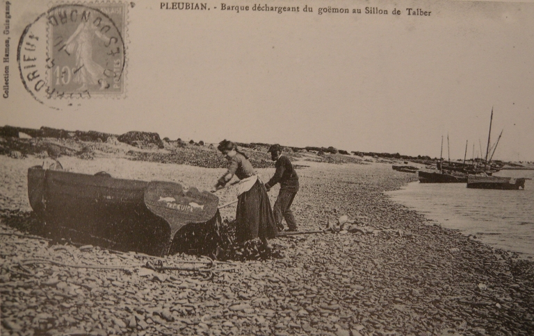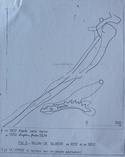 Le Sillon de Talbert est divisé en 4 parcelles sur le cadastre de 1829 : le Sillon est figuré en section A, parcelle 1103, avec la 'Pierre à goémon' indiquée au milieu du Sillon, le cordon de galets au bout du Sillon (A 1104), après 'Toull Sten', l'Île au Rats (A 1104) et le dernier îlot (A 1106). Ce très ancien sillon, issu de la dernière glaciation et de la transgression flandrienne (fonte des glaciers de la vallée du Trieux et de la rivière de Tréguier), aurait déjà 15 000 ans d´âge, alors que le Sillon Noir (au Nord-Est de la petite grève) serait antérieur à la dernière glaciation. Une autre hypothèse sur la formation du Sillon est proposée par le chercheur Pierre Stéphan du Laboratoire GEOMER (annexe n°3). Les recherches archéologiques de R.P. Giot, publiées en 1967, ont permis de dater l'occupation humaine du Sillon au moins depuis la fin du Néolithique (3300 et 2300 avant J.C.), avec la découverte de silex, tessons de poteries et restes de foyers. Depuis sans doute un bon millier d'années, le Sillon de Talbert sert de base à la récolte du goémon (goémon de coupe et d'épave). La petite grève du Sillon accueille les bateaux goémoniers et les dromes (radeaux de goémon). Les pêcheurs à pied exercent leur activité sur le platier rocheux et dans les îlots d'Ollone, y aménagent de véritables pêcheries, posent des lignes de fond et des filets de barrage (entre l'Île Blanche et le Sillon et au niveau du 'Genouil' ou du 'Ster' dans la 'grande Grève'). Louis-Marie Faudacq (1840-1916) a peint et dessiné ces 'travailleurs de la mer' à la fin du 19ème siècle. Dans son article intitulé 'Les faucheurs de la mer', publié en janvier 1906 dans la 'Revue des Deux Mondes', Charles Le Goffic donne un étonnant tableau de ce qu'était le Sillon quand commençait cette moisson ou coupe du goémon, nommée 'ar verz', à partir du mois de février. Plus récemment, les témoignages oraux évoquent les fours à goémon à la base du sillon (déjà cités au cours du 19ème siècle et peints par le douanier Faudacq), le séchage du goémon en meules imposantes et la pratique du pacage sur la dune et dans la petite grève. En 1844, un industriel de la soude, Chauvel fit construire plusieurs 'fourneaux' et un magasin sur le Sillon. Cependant, le comice agricole du canton obtint auprès du Conseil général et du préfet, selon ses doléances, de chasser cet 'étranger', fabricant de soude. Pour aller de l´une à l´autre de ces grèves on traversait autrefois le sillon (soixante mètres environ de large au maximum) avec des attelages, au niveau du et derrière le 'Chouk' ('le dos', 'la nuque' en breton) pour charger algues et galets sur la côte au vent. Cette multiplicité des usages sur un même site s'est développée de façon cohérente et en ménageant tant la ressource algale que le support physique de ces activités jusqu'au milieu du 20ème siècle. C'est la valeur d'usage qui fait la référence et la parité entre des acteurs et des producteurs locaux. Ce qui construit et cimente une culture littorale. L'exploitation industrielle des agglomérats marins (sables, graviers) effectués aux alentours du sillon depuis le début du 20ème siècle par les sabliers a contribué à la fragilisation du cordon littoral qui protège la pointe de Lanneros. L'exploitation par une compagnie privée en 1928 est dénoncée par le Conseil municipal de Pleubian. Lequel autorise néanmoins en 1930 l'extraction de galets de 100 m3 pendant 6 mois pour l'entretien des chemins communaux. Le véritable divorce ethno-écologique s'est déclaré une première fois lorsque des nouveaux usagers du site (les soldats de l'organisation allemande 'Todt', pour construire le 'Mur de l'Atlantique') ont prélevé des quantités importantes de galets à partir de 1942 pour construire des blockhaus et empierré les routes. La modélisation de cette activité s'est poursuivie au niveau de l'Île Blanche par les habitants eux mêmes pendant le temps de la reconstruction. Puis à partir des années 1960, les tracteurs des cultivateurs avec leurs remorques sont venus, depuis les communes environnantes (Paimpol), envahir le Sillon et ramasser les goémon d'épave, en négligeant certains règles d'usages. A partir de 1969, le Sillon qui faisait partie du domaine privé de l'Etat, est passé sous la responsabilité de la commune de Pleubian, pour essayer de freiner la dégradation du site et la rupture prévisible du cordon de galets. Elle a obtenu le renfort de 11 autres communes pour créer sous la présidence de Max Querrien, maire de Paimpol, le 'Syndicat intercommunal pour la sauvegarde du Sillon' et la constitution d'un syndicat mixte associant le Conseil général et la Chambre d'agriculture. Dés 1974-75, un premier enrochement et un épi transversal (à la base) sont réalisés ; l'enrochement en ligne sera prolongé en 1982 sur 1300 mètres, alors qu'on pratique un re-profilage de la crête et qu'on empierre un passage dans la dune en 1982. D'autres grands travaux seront réalisés par la suite entre 1987 et 1989, afin de remodeler les enrochements parallèles au Sillon. En 1988, on installe un filet expérimental pour essayer de retenir les galets et pour arrêter l'étalement du sillon. On installe en plus un brise-lames. Cependant, tous ces travaux coûteux s'avèrent inefficaces et aggravent la situation. Ils bloquent l'engraissement naturel du Sillon et accélèrent l'érosion derrière les enrochements. Les tempêtes successives comme celle de janvier 1988, parviennent même à briser le cordon. Au 1er janvier 1992, le Syndicat rend son bien à l'Etat. Le Sillon, par trop artificialisé, se voit refuser le label 'Grand Site' par la DIREN. En 1994, la commune de Pleubian accepte l'établissement d'une zone de préemption de 30 hectares, sur laquelle le Conservatoire du Littoral pourra intervenir sur un aménagement global du Sillon à Penn Lann. En 1996, le Conservatoire dema