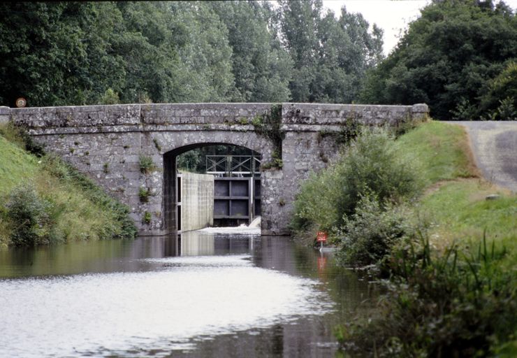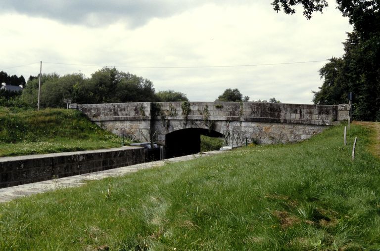 Pont sur écluse, en aval ; une arche en arc surbaissé : pierre de taille de granite, parapet appareillé.