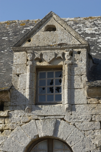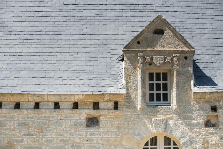 Corniche à modillons. Appui mouluré. Lucarnes à fronton courbe et décor issu du répertoire de la renaissance : cariatides, triglyphes, amortissement à boules. Des blasons non lisibles sont également sculptés aux lucarnes.