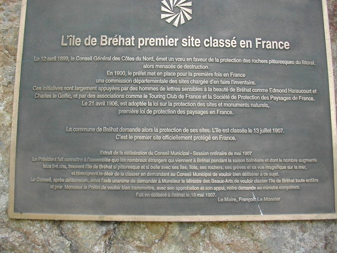 En 1844, le biologiste marin Armand De Quatrefages publiait dans ses 'Souvenirs naturalistes', ses réflexions à la fois scientifiques et philosophiques sur les espaces maritimes de l'Île de Bréhat. Il saluait la richesse de la faune et de la flore sous-marine bréhatine. En 1900, la Société de Protection des Paysage de France, le Touring Club de France, appuyés par plusieurs personnalités du monde des arts et des lettres, dont le poète Edmont Haraucourt et l'écrivain Charles Le Goffic, demandèrent à plusieurs reprises, que l'Île de Bréhat soit protégé pour la qualité de ses sites naturels. Une commission départementale des sites fut décidé par le Préfet, qui proposa de classer l'Île de Bréhat. La loi du 21 avril 1906 sur la protection des sites et monuments naturels, de caractère artistique et pittoresque, fut promulgué et L'Île en fut la première bénéficiaire, cependant cet arrêté ne s'appliquait qu'aux seules parcelles communales. Le 13 juillet 1907, l'ensemble de l'Île de Bréhat fut le premier site officiellement protégé et classé en France, au titre de la protection des sites. Par arrêté du 14 février 1929, le classement fut étendu aux parcelles A211 et A231, appartenant à l'écrivain Haraucourt. Le 30 juillet 1935, la Pointe du Goaréva ou de la Citadelle (C 1448-1455, 1503-1505, 1509-1620), fut inscrite à l'inventaire supplémentaire des sites. Le 9 mai 1940, le site du moulin à marée du Kerpont et ses dépendances fut aussi classé. Le 26 mars 1980, le classement fut étendu à la totalité de l'archipel de Bréhat. Ce décret s'applique à l'île Sud (Croix Maudez, étang du Birlot, le Fort, le Port-Clos), à l'île Nord (section A1, A2, A3 à l'exception de 43 960, 963-970) et aux îles secondaires (îles Ar Morvil et Ar Ouis, Voulch et Séhéres, Raguénes Meur, Raguénés Vian, Roc'h Losquedic, lavrec, Roc'h Ru, Logodec, Raguenec, Guillamgor, l'Île Verte, Ar Voul, Le Groezen et Béniguet), ainsi que les îles non cadastrées. En 1982, l'IGN établissait pour l'Île de Bréhat et sur l'ensemble des espaces côtiers du Département la carte des usages des sols, dénommée IPLI, Inventaire permanent du Littoral, avec une forme de zonage des activités littorales et de l'occupation de l'espace. En 1998, la Direction Régionale de l'Environnement de Bretagne (DIREN) a réalisé avec les services départementaux de l'Etat (DDE) et le service des Espaces Naturels Sensibles du Département des Côtes-d'Armor, un inventaire des espaces littoraux remarquables du département. Elle a fait des propositions de gestion et de vocation de ces espaces naturels. Cependant, l'Île de Bréhat a peu conservé des espaces publics naturels, ayant un statut de propriété communale ou départementale. Toutes les îles de l'archipel bréhatin sont privées, sauf l'Île Morbic et hors quelques parcelles communales, peu accessibles, à Lavrec et à Béniguet.