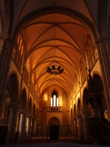 Église à volumétrie importante et à trois vaisseaux construite sur un plan en croix latine. Elle est composée, de l'ouest vers l'est, d'une tour-porche carrée dans-oeuvre recevant l'étage de cloches, d'une nef à cinq travées flanquée sur toute sa longueur de deux bas-côtés, d'un transept et d'un choeur flanqué de chaque côté d'un bâtiment en appentis. Le couvrement de l'espace intérieur est formé par une voûte d'ogives. Le chevet à trois pans présente à la base une pierre agrémentée du millésime 1892. La tour occidentale est coiffée d'une flèche en maçonnerie et les pignons présentent des rampants à crossettes. La maçonnerie est édifiée en moellons de grès rose équarris. Les chaînes d'angles, l'encadrement des baies, les contreforts et les rampants des pignons sont édifiés en pierre de taille de granite à ton clair. Le couvrement de l'espace intérieur est formé par une voûte d'ogives.