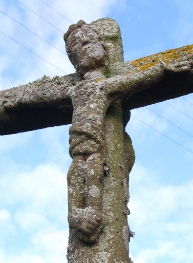 Croix de chemin composée d'un soubassement portant un socle galbé sur lequel est dressé un haut fût monolithe supportant une croix terminale. La croix terminale est ornée d'un Christ en croix (face) et d'une Vierge couronnée à l'Enfant (revers). Le fût est sommé d'une bague moulurée en cavet dont la face présente l'inscription IHS MAJOSEPH : M : O : MAIGNOV. Le Christ en croix est surmonté du titulus (INRI).
