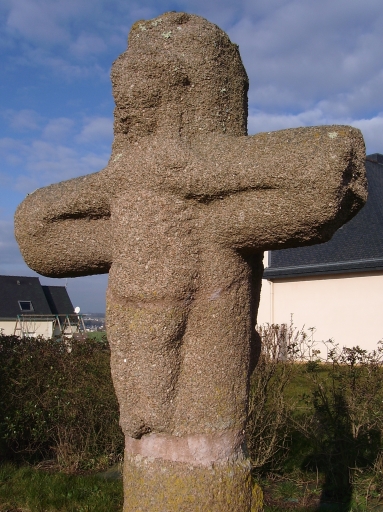 Croix de chemin à fût écoté en granite, anciennement croix monolithe, dressée sur un socle à griffes dont la face présente l'inscription 1588 R : LE GOASTER. Elle est ornée d'un Christ en croix (face) et d'une Vierge couronnée à l'Enfant (revers).