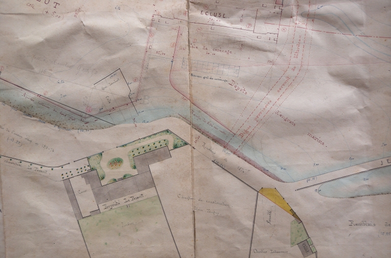 Archives départementales des Côtes-d'Armor. S Suppl. 131. Agrandissement du bassin à flot, 1884-1888. Construction d'une passerelle déversoir en 1898, comblement des cales d'échouage et reprise en sous-oeuvre des quais, nouvelle écliuse, projet jetée neuve de Kernoa, avec quai de platier et cale de débarquement.