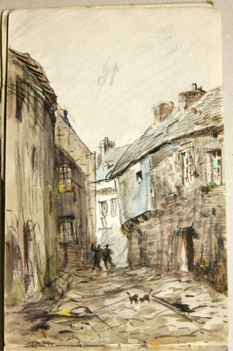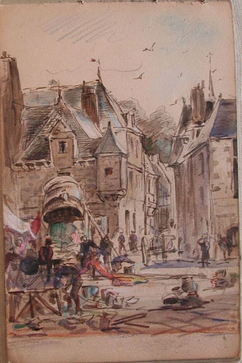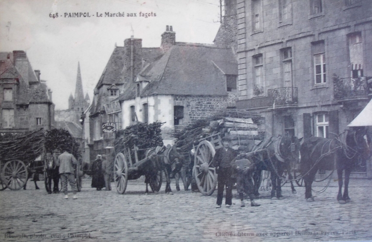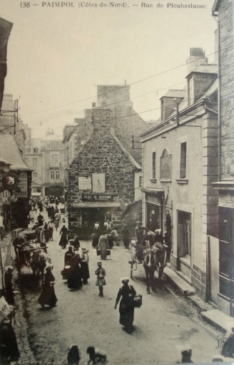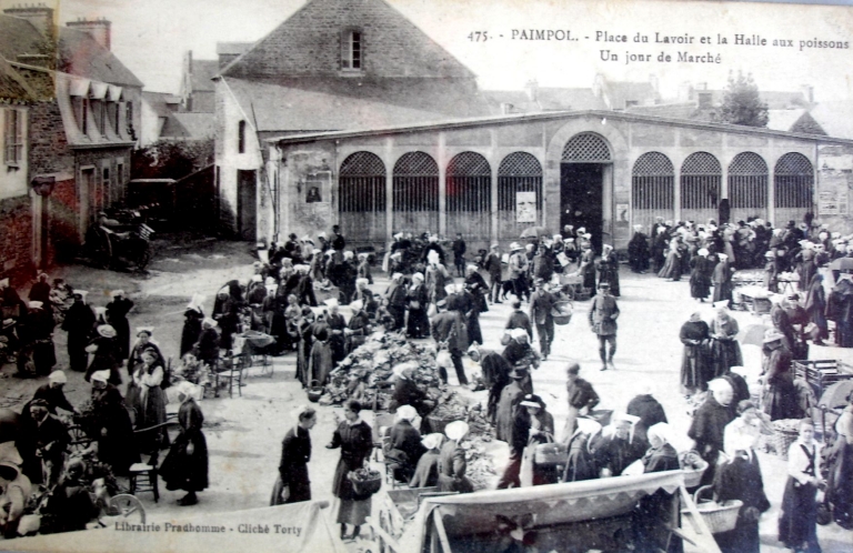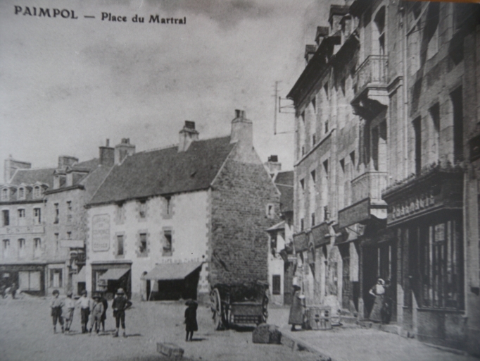 En l'An II de la République, l'actuelle Place du Martray était appelée la 'Place de la Liberté', où siègeaient la municipalité, le tribunal de commerce et le juge de paix. L'immeuble actuel de la Caisse d'épargne servit de mairie jusqu'en 1910, transférée ensuite dans la propriété d'un ancien armateur Savin. Le peintre douanier Louis-Marie Faudacq (1840-1916), chroniqueur de la vie rurale et maritime du Trégor-Goëlo, a souvent illustré dans ses carnets, la place du Martray à Paimpol, avec ses multiples commerces et ses maisons traditionnelles, dont la datation est comprise entre le 15ème et le 19ème siècle. Les jours de marché sont particulièrement mis en valeur dans ces dessins aquarellés. L'architecture de la place du Martray a peu changé durant le 20ème siècle. Les façades de certaines maisons ont pu subir un ravalement, cependant, certains bâtiments ont conservé une niche, abritant une statuette de la Vierge, à la suite du voeu fait à l'occasion de l'épidémie de choléra en 1849. Les commerces ont changé de fonction. Deux dates portées sur des maisons traditionnelles sont à citer en référence : 1581 et 1763. La crêperie Morel est certainement la plus ancienne maison de cette place de marché, datée du 15ème siècle. En 1911, la venelle Conan disparaît. La rue du Temple au début du 20ème siècle est devenue la rue de l'Eglise. En 1912, la commune entreprit la construction d'un trottoir de 3 mètres de large et le repavage de la place. L'historien amateur paimpolais Jules Le Chapelain (1853-1928) a publié une série d'articles 'Etude sur Paimpol' dans le journal de Paimpol (en signant comme auteur 'Klasker'), entre le 1er janvier et le 20 mars 1897. Il a aussi publié 'Paimpol Guide' en 1907, auprès de l'imprimeur Le Flem, sans apposer sa signature personnelle. Il a publié une seconde série d'articles, avec sa signature originale 'Le passé de Paimpol' dans le 'Journal de Paimpol' de 1927. Ces écrits permettent de dater et de raconter l'histoire des maisons traditionnelles de Paimpol.