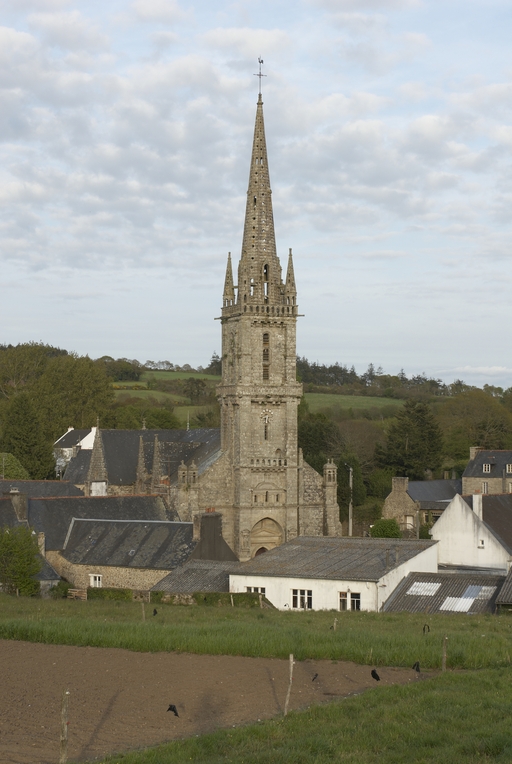 Edifice de plan en croix latine à transept peu saillant, situé dans un enclos, mesurant 46 mètres de long et 27 mètres de large. Chevet plat. Choeur profond à deux travées flanqué de deux sacristies hors oeuvre de plan rectangulaire au nord et au sud. Porche sud dans-oeuvre à voussures en accolade, sommé d´un larmier et flanqué de colonnettes engagées soutenant pinacles et gâbles en accolade orné de crossettes et d´un fleuron. La tour-porche de 33 mètres, est composée d´un porche dans-oeuvre en arc brisé encadré de deux colonnes cannelées et renflées à chapiteaux corinthiens supportant un fronton triangulaire coiffé de la statue de Saint-Émilion. Le blason de la famille de Plougras ("d´argent à la croix pattée de gueule") est visible sur le tympan. Au premier étage, une moulure à corbelets soutient une galerie à pilastres supportant un fronton cintré accosté de gargouilles en canonnière. La tour-porche est encadrée de contreforts en équerre sommés de lanternons et flanquée d´une tourelle d´escalier coiffée d´un lanternon ajouré. Le clocher à chambre de cloches ajourée, ceinte d´une balustrade (ou galerie) en encorbellement soutenue par des corbelets, est amorti d´une flèche octogonale ajourée, de 17 mètres, encadrée de quatre gâbles et de quatre clochetons et ceinte d´une balustrade à gargouilles en canonnière. Gros-oeuvre en grand appareil régulier de granite. Nef à trois vaisseaux de six travées couverte d´un lambris. Arcades en arc brisé pénétrant dans les colonnes. Sol couvert de dalles de granite.