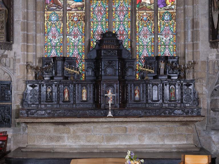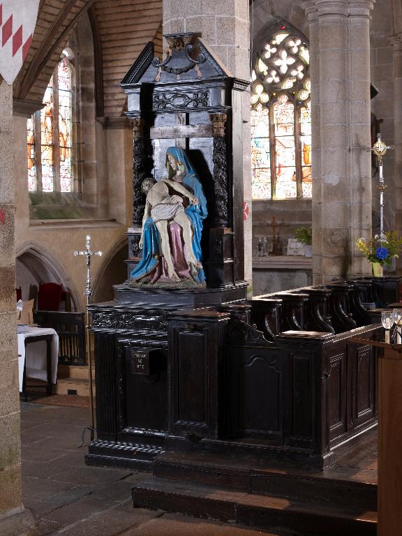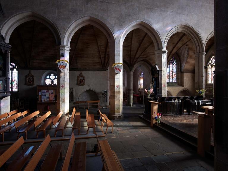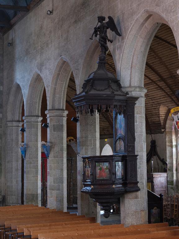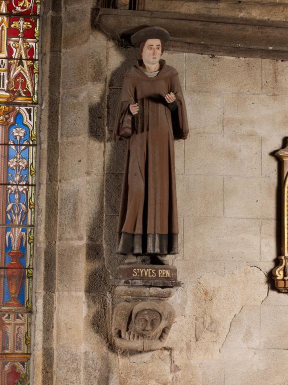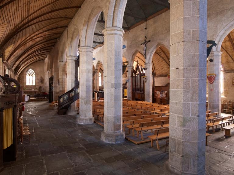 A voir à l'intérieur de l'église, les remarquables sablières de la chapelle dite de Keranrais dans le bras nord, un sacraire et des bénitiers finement sculptés, des fonts baptismaux ornés du 16e siècle, une chaire à prêcher du 17e siècle, un lutrin en pied ou les stalles du chœur du 18e siècle. Parmi les statues, on pourra observer une intéressante statue du « Christ aux liens » et une Pietà ou Mater dolorosa. Un des vitraux modernes représente un accident dans un moulin à eau : le meunier est sauvé par l'action de saint Yves. Enfin, l'une des bannières a été créée pour commémorer le souvenir des Morts pour la France de 1914-1918. L'horloge du clocher date de 1870.