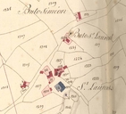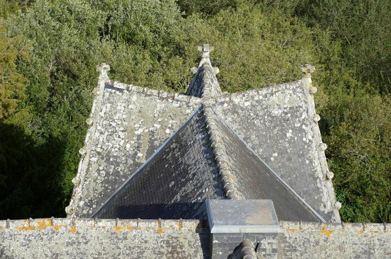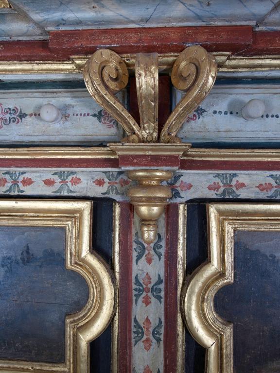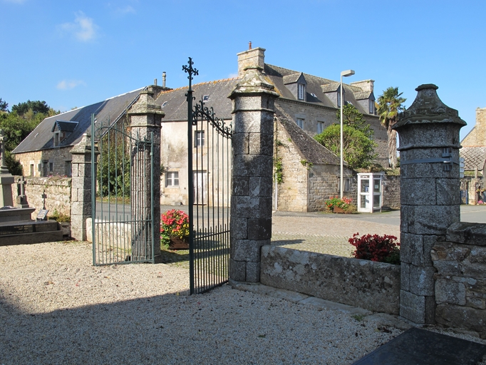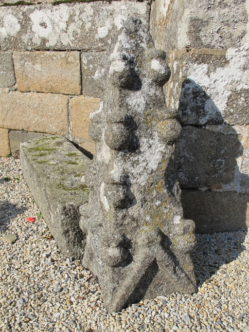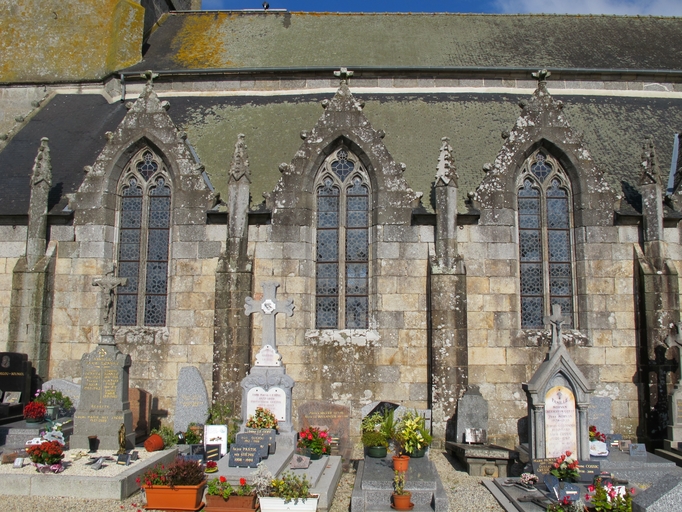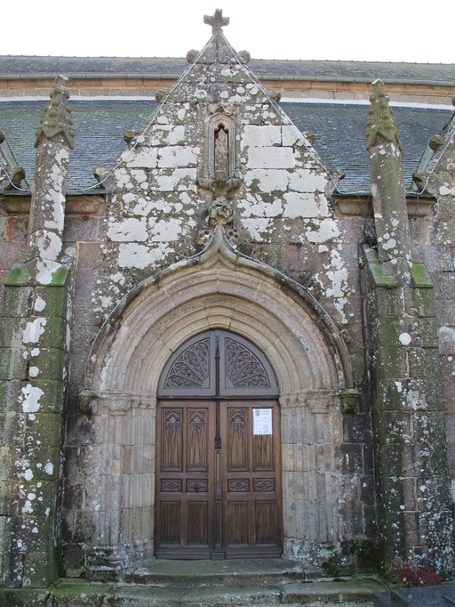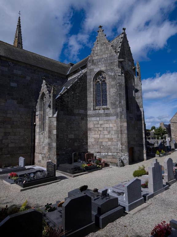 Mobilier : Maître-autel du 17e siècle provenant de l'ancienne chapelle Saint-Louis de Rosambo [Rosanbo]. De chaque côté, deux colonnes en marbre, servant de supports à des statues modernes, proviennent de l'ancien retable du 17e siècle dont d'autres débris, en tuffeau et décorés de têtes d'angelots, sont conservés au presbytère. Ces matériaux indiquent un atelier de Laval ; et, d'ailleurs, un très beau retable, dû au même atelier et à la munificence des seigneurs de Kerohent, subsiste toujours dans l'église paroissiale de Séglien [commune du Morbihan].