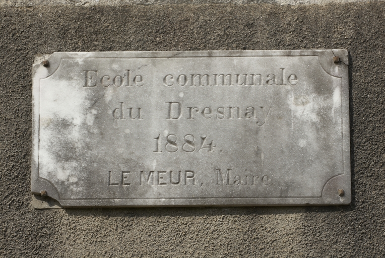 Ecole primaire publique du village du Dresnay, de plan rectangulaire, à un étage et trois travées, construite en moellon de granite et de schiste enduit de ciment, à l´exception des encadrements des baies en pierre de taille de granite, couverte d´un toit à longs pans et pignons couverts. Au rez-de-chaussée, deux salles de classe, à l´étage, logement des instituteur. Cour d´école au nord avec préau transformé en seconde salle de classe.