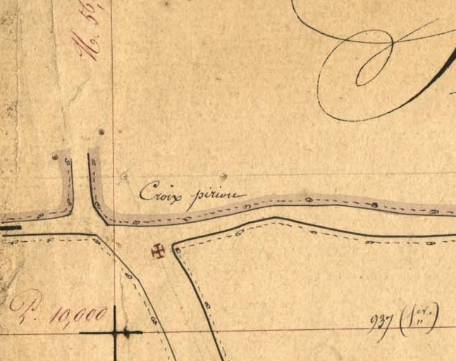 Cet édicule est datable du 18e siècle (soubassement, table, socle et fût), il figure sur le cadastre ancien de 1848 associée au toponyme "croix Piriou". La croix date vraisemblablement de la 2e moitié du 19e siècle.