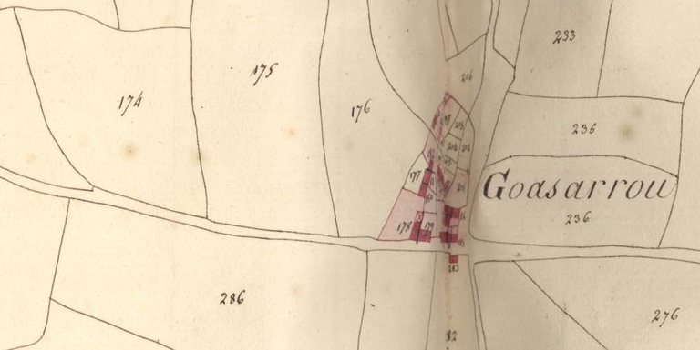 Cette maison est située dans un hameau en bordure de la route qui va de Lanvellec à Tréduder. Composé d´une quinzaine de bâtiments distincts, le hameau figure sur les cadastres de 1813 et 1848 associé au toponyme "Goas ar rou" / "Goas arou". Le nom est vraisemblablement formé de "Goas" qui signifie "le ruisseau". La maison porte le millésime 1665 mais elle a été vraisemblablement reconstruite au 19e siècle.