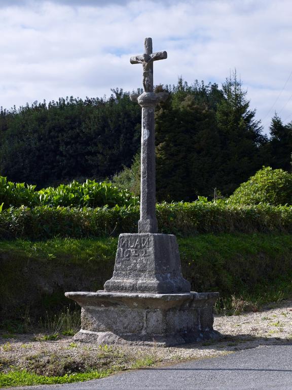 Édicule en granite gris situé à l´ouest du village de Saint-Carré en bordure de la route. Il est composé d´un soubassement avec table moulurée sur lequel repose un socle gravé et orné surmonté d´un long fût de section quasiment circulaire (à angles abattus mais à base carré) sommé d'une croix ornée d'un groupe de la Crucifixion à trois personnages (seul le Christ en croix, sculpté en haut-relief subsiste).