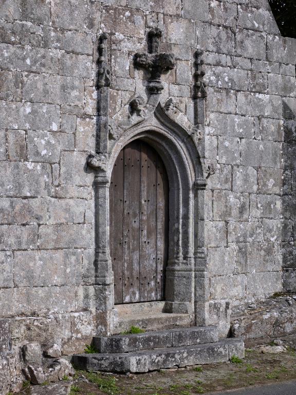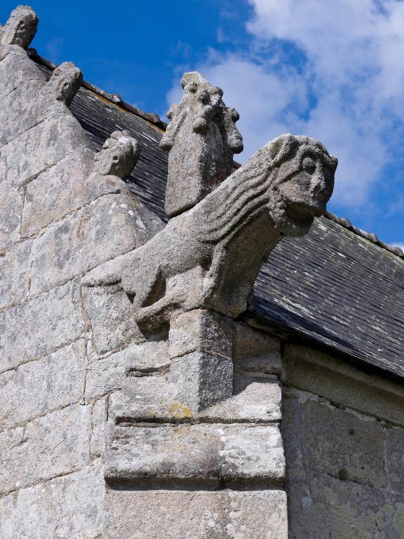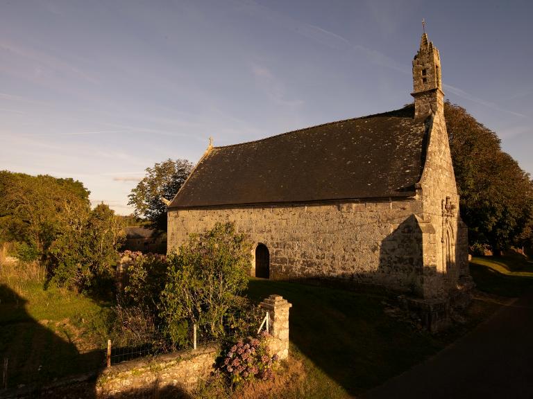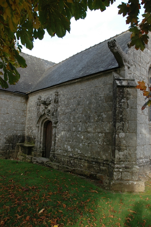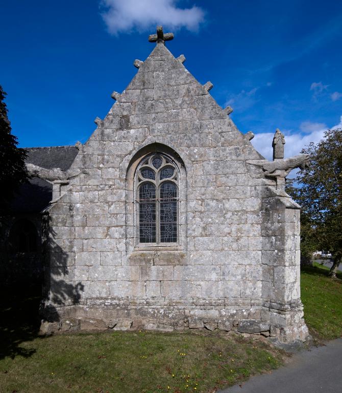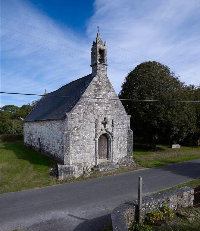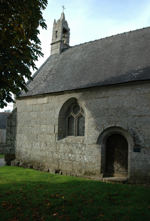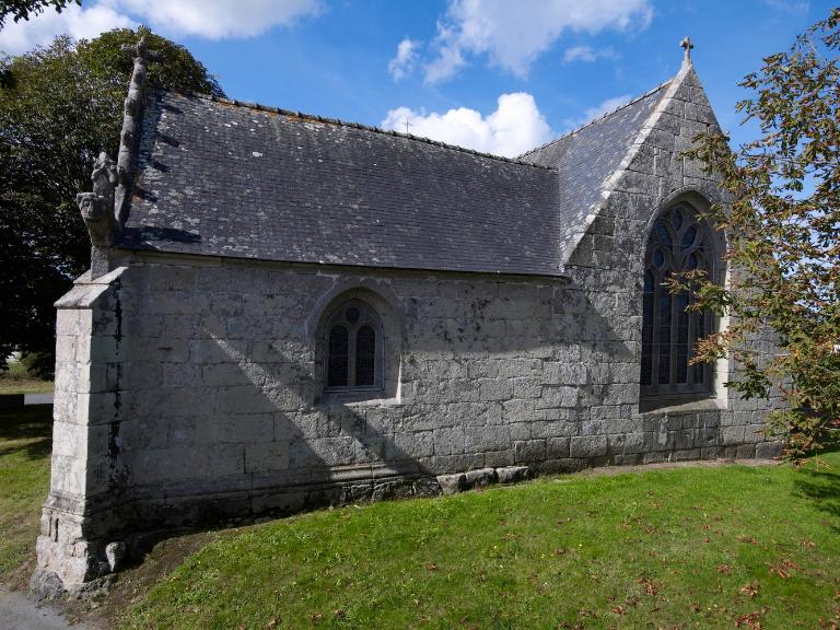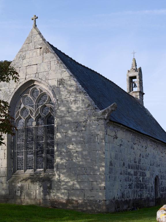 Edifice de plan rectangulaire à vaisseau unique construit en pierre de taille de petit et moyen appareil de granite, augmenté d'une aile en retour d'équerre au sud. La chapelle est ouverte de trois portes ornées : à l´ouest dans le mur-pignon, dans le mur sud et dans le mur ouest de l´aile en retour d'équerre. Elle présente un chevet plat percée d´une baie à remplage de pierre, tandis que les élévations sud sont ouvertes de deux autres baies à remplage. Toit à longs pans et pignons découverts à rampants et crossettes. Les angles sud-ouest, sud-est et nord-est présentent des crossettes sculptées représentant un lion.