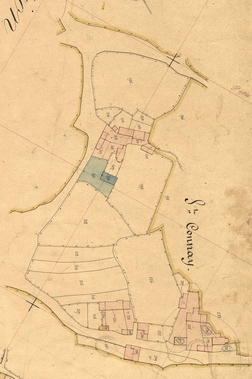 Si la croix de Saint-Connay (bulbe et fût y compris) peut remonter au 17e siècle, l´emmarchement et le socle semblent plus tardifs (2e moitié du 18e siècle, voire début du 19e siècle). La croix figure sur le cadastre de 1848.