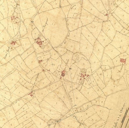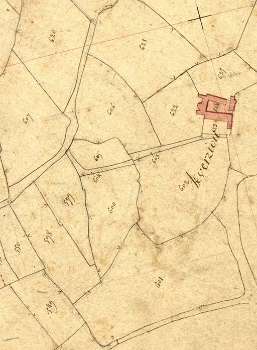 - un long bâtiment orienté au nord à usage de grange, il est percé d´une porte charretière en plein cintre, moulurée en cavet. La grange a été réduite à l´ouest comme l´atteste le cadastre de 1835 afin d´ouvrir la cour au sud lors de la construction du nouveau logis.