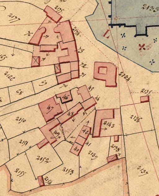 Ensemble composé en 1835 de trois logis mitoyens. Le logis sud a été détruit. Le logis central est datable de la fin du 16e siècle ou du début du 17e siècle si l'on se fie à la mise en oeuvre en pierre de taille de granite de grand appareil et à l'analyse stylistique des ouvertures : porte en arc déprimé et fenêtres rectangulaires à chanfrein. La forte pente originelle du pignon nord est également un indice d'ancienneté de l'édifice. Le logis nord a été remanié au 19e siècle.