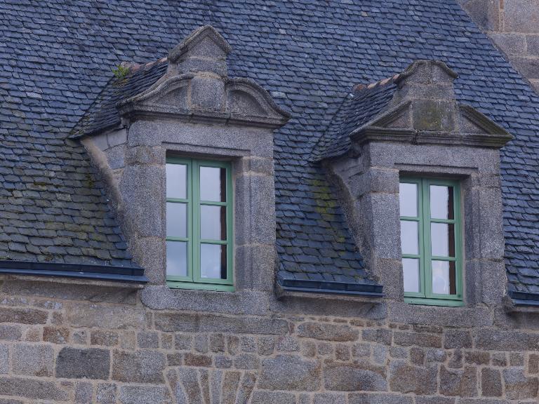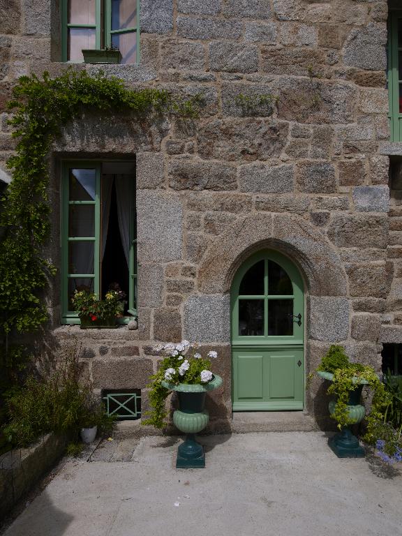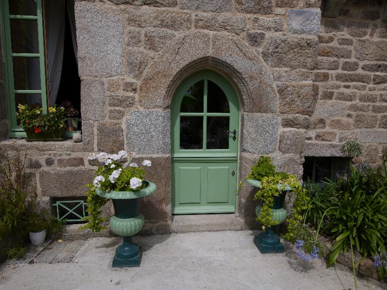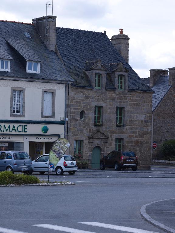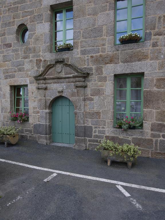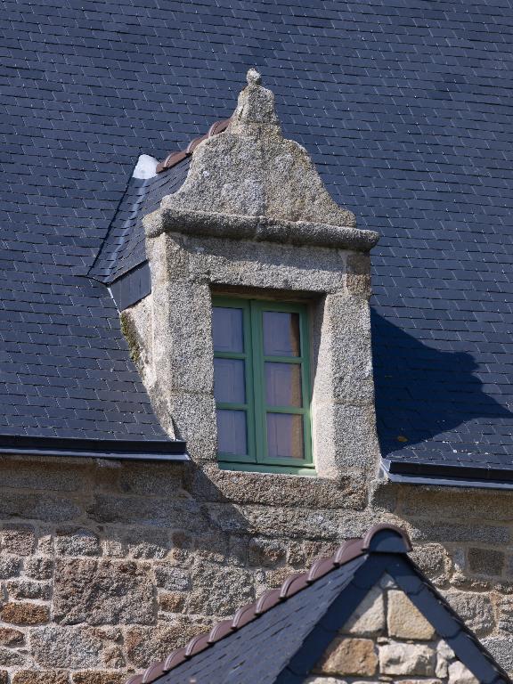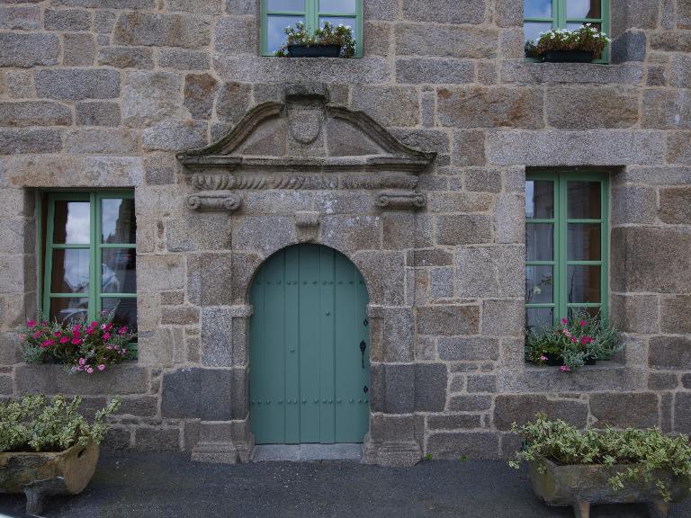 Maison à étage, située au sud de la place de l´église, et orientée au nord. Elle est construite en pierre de taille de granite de moyen appareil. La porte du rez-de-chaussée, en plein cintre est encadrée de pilastres et surmontée d'un fronton orné d'un écu. Les fenêtres (deux au rez-de-chaussée dont une, à gauche, issue d´un percement secondaire et deux à l´étage) sont rectangulaires et ne portent pas de décor particulier. Un oculus a été aménagé au premier étage. Deux lucarnes à fronton ouvragé donnent de la lumière dans l´étage de comble qui semble avoir été, dès l´origine, habitable. La souche de cheminée (moulurée) nous indique que les cheminées ont été aménagées dans le pignon ouest. Corniche moulurée. La toiture à longs pans et croupe à l´ouest est couverte d'ardoise.
